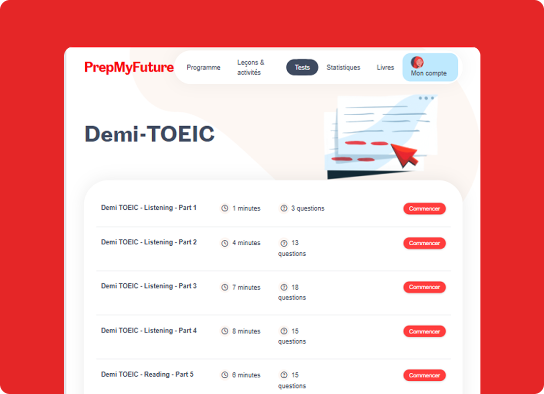 PrepMyFuture est une plateforme 100 % en ligne dédiée à la préparation aux tests de langue et certifications. Une fois inscrit, vous accédez à un parcours structuré avec des cours, des exercices interactifs et des outils de suivi de votre progression.