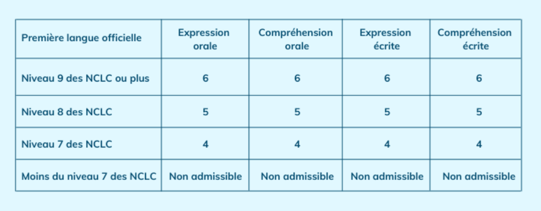 - Si votre première langue officielle choisie est le français, vous devez valider un niveau minimum NCLC 7 dans les quatre compétences du test.