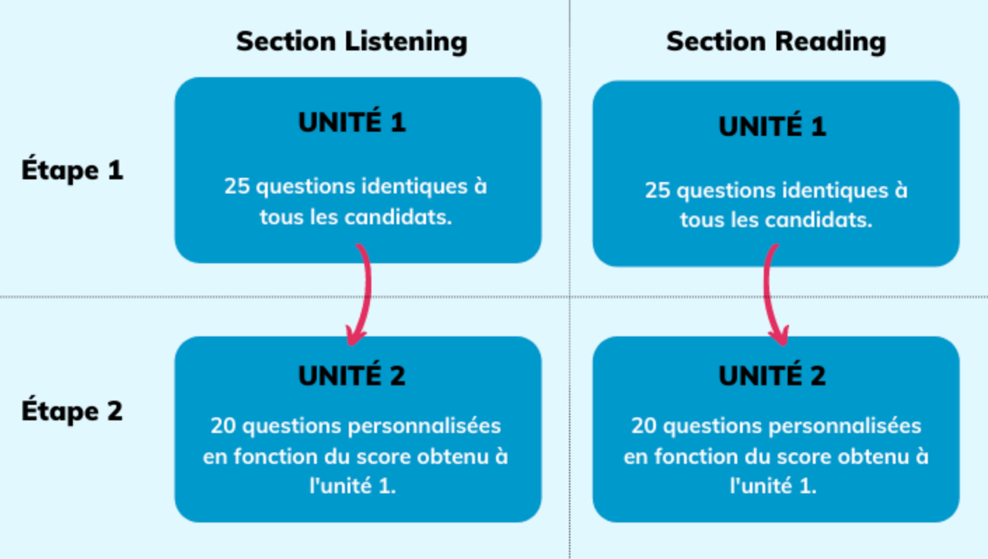 Le déroulé du TOEIC adaptatif diffère légèrement du TOEIC classique, puisqu’il se déroule de la manière suivante :
