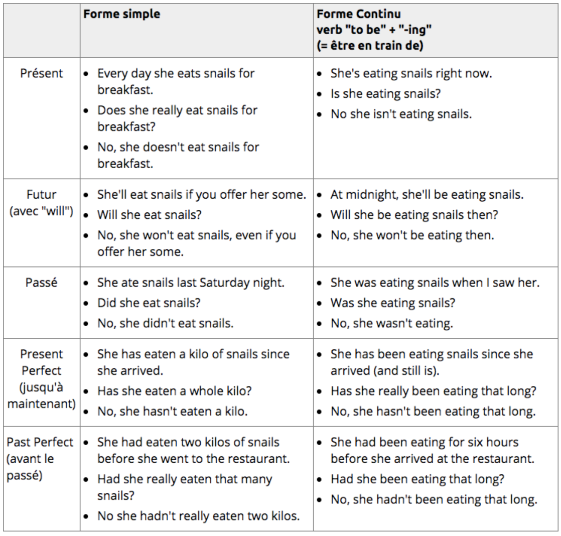 La grille ci-dessous donne un aperçu général du système des temps en anglais. Contrairement au français, il y a très peu de conjugaisons en anglais. Prenons l'exemple du verbe "eat" (manger). En français, les formes de ce verbe sont très nombreuses (manger, mangé, mange, mangeons, manges, mangeant …), tandis que le verbe "eat" en anglais n'a que cinq formes : eat, eats, eating, ate, eaten.
