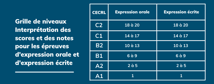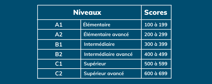 Le score obtenu est ensuite associé aux niveaux de l’échelle CECRL du Cadre Européen :